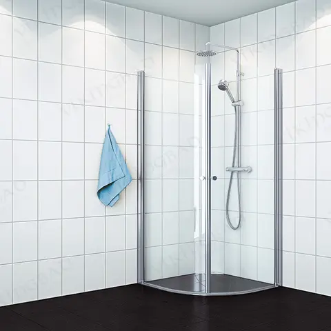 Dusjhjørne i glass som består av doble svingdører. Leveres som avbildet med veggfester og dørhåndtak.